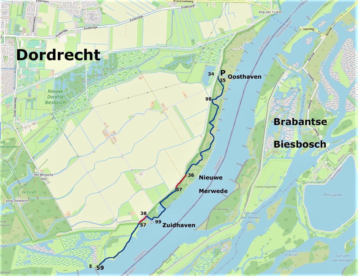 Het Eiland van Dordrecht wordt aan de oostkant begrensd door de Nieuwe Merwede, een brede rivier met veel schepen (route Antwerpen – Ruhrgebied). Tussen de twee haventjes Oosthaven en Zuidhaven ligt buitendijks een strook Biesbosch van ca 800 m breed en 3 km lang. Door dat gebied lopen heel veel paden. Je kunt van alles proberen, maar verdwalen kan niet omdat het ingeklemd ligt tussen de rivier en de dijk. Onderlangs de dijk loopt een geasfalteerd fietspad, maar in het gebied zelf is alles onverhard. Met droog weer zijn het graspaden en paden van aangestampt leem, maar in regenachtige tijden moet je met je hoge schoenen of laarzen op sommige plekken door smeuïge modder. In de wintertijd kunnen er periodes zijn dat het water zo hoog staat dat je er niet doorkomt. Een stukje van het traject loopt over het fietspad (36-37). Aan het eind van het Biesboschgedeelte kom je bij de Zuidhaven. Vandaar kan je teruglopen via andere paden. Je kunt ook nog een heel mooi stuk doorlopen, de weidsheid van het rivierenland ervaren op de kade van het Zuidplaatje en aan het einde uitrusten op een bankje waar je uitkijkt over het moerassige vogelgebied van de Tongplaat. |