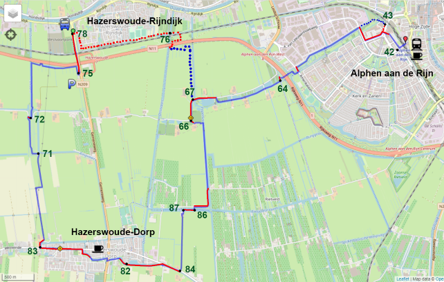 Start knooppunt 78. OV halte Gemeneweg, Hazerswoude-Rijndijk. Vanaf halte stukje naar het zuiden lopen. Bij het tweede knooppunt 75 is een carpool-parkeerterrein, afslag Hazerswoude N11.